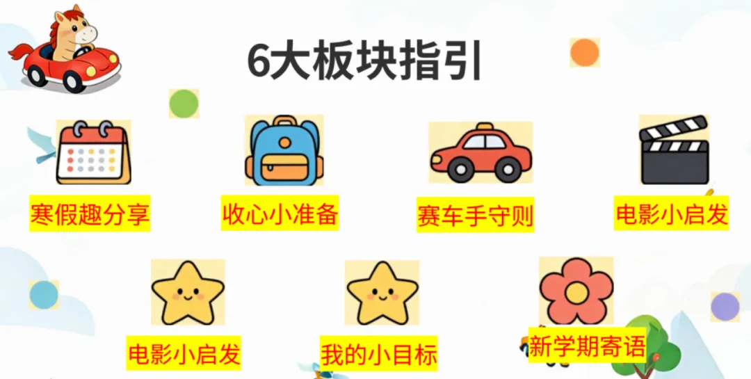从寒假趣事回顾,到新学期状态调整,再到班级规则和目标设定,一站式完成开学第一课核心内容,让孩子们化身小小赛车手,勇敢踏上新学期的征程!