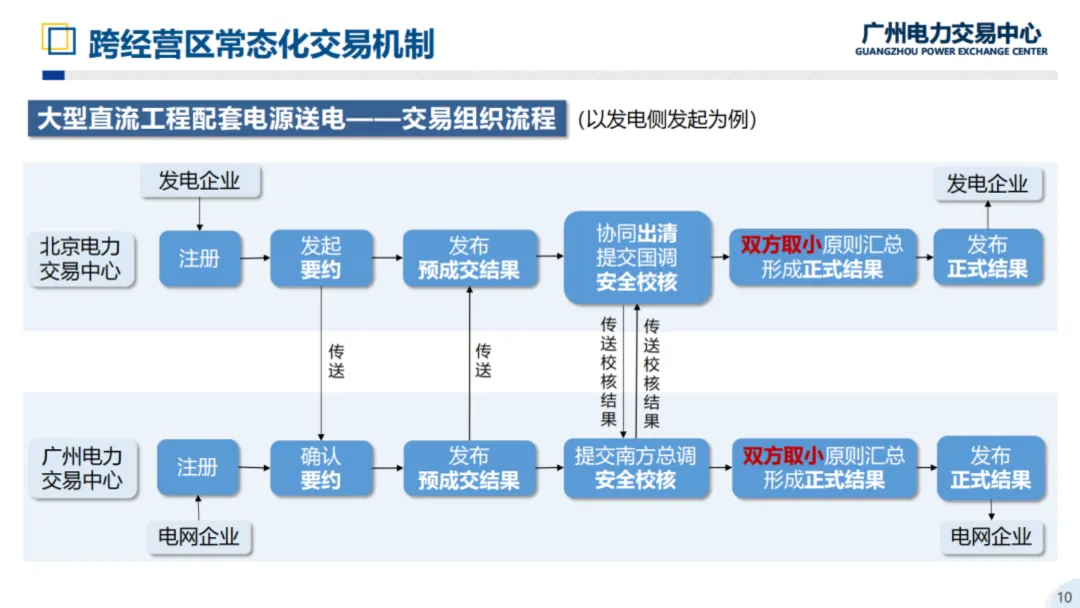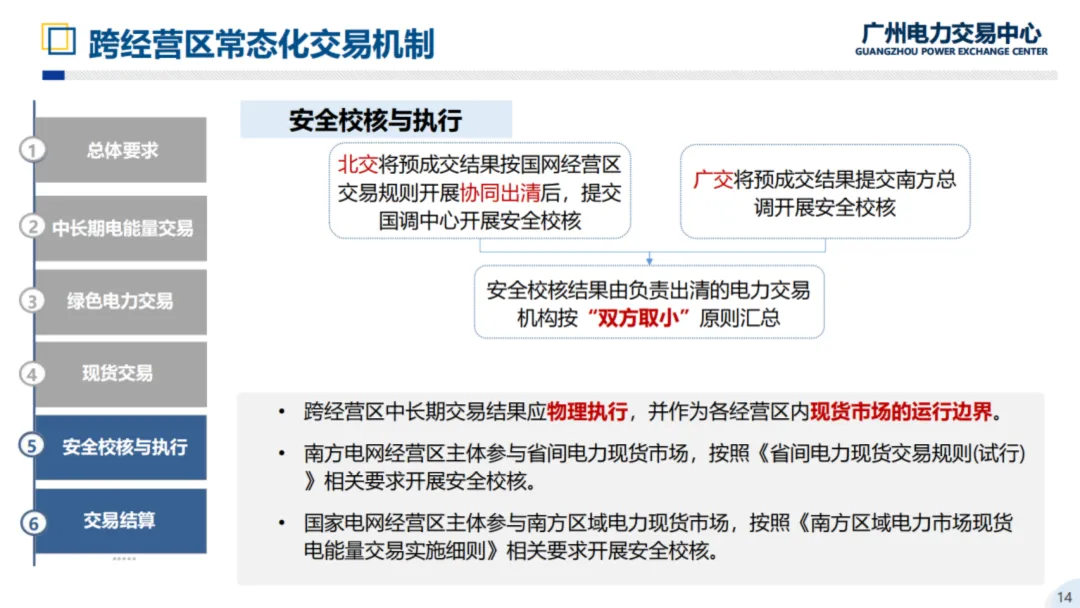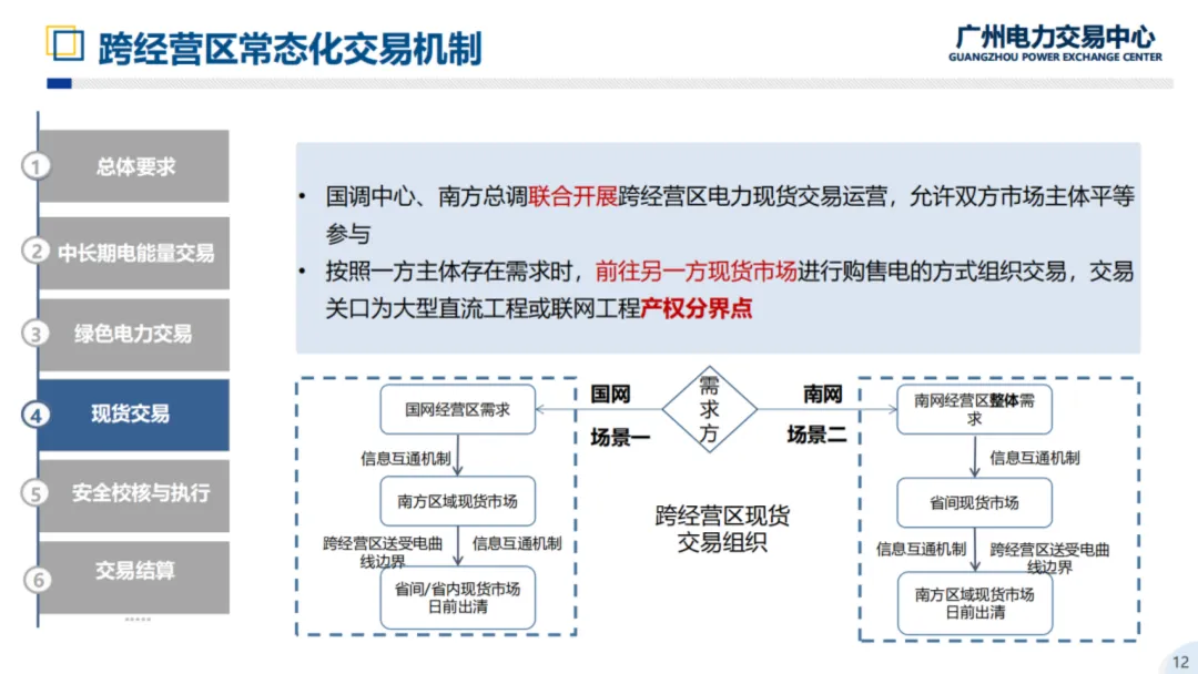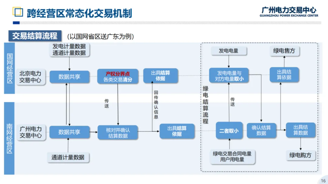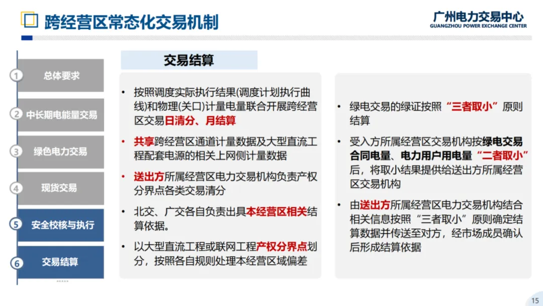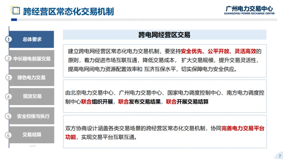 该机制坚持安全优先、公平开放、灵活高效原则,着力促进市场互联互通,提升电网间电力资源配置效率。交易类型涵盖中长期电能量交易、绿色电力交易和现货交易,组织方式包括双边协商、挂牌、集中竞价等。其中,绿色电力交易明确申报信息需包含电量、整体价格及绿证价格,购电方与售电方可通过交易平台实现跨区对接;现货交易由国调中心与南方总调联合组织,允许双方市场主体平等参与,交易关口设为大型直流工程或联网工程产权分界点。北京电力交易中心、广州电力交易中心等联合开展交易结算,按照调度实际执行结果和物理计量电量进行日清分、月结算。