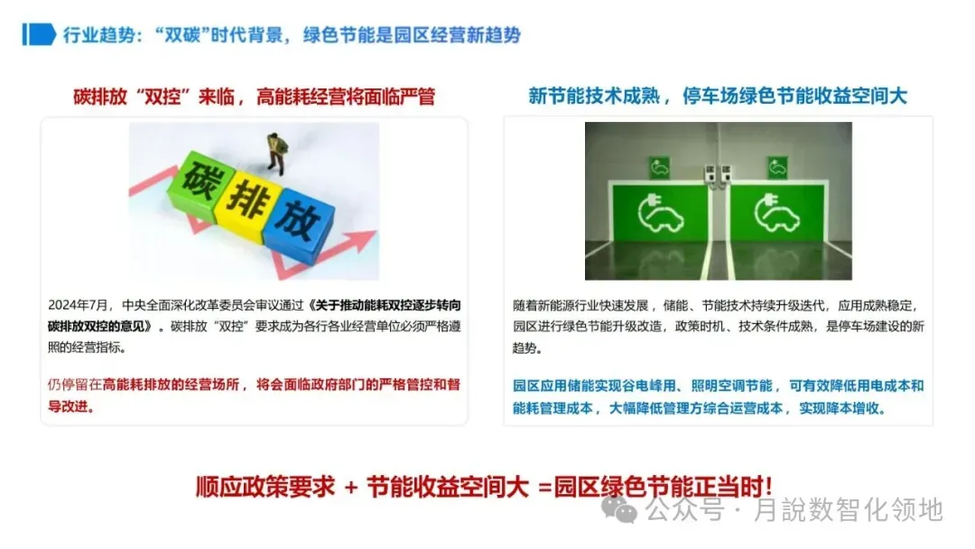 “十五五” 规划纲要对 “双碳” 工作的部署,从 “碳达峰攻坚” 转向 “稳中有降、绿色转型”,智慧产业园区需将绿色低碳理念贯穿全生命周期: