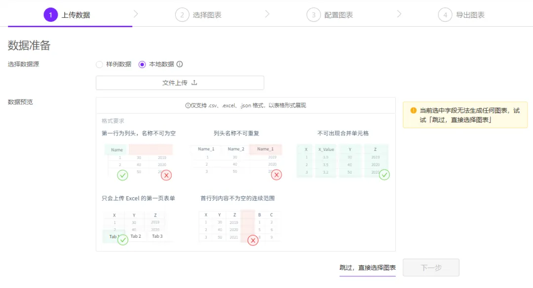上传数据阶段,可以直接从本地上传csv、excel和json等格式的文件,也可以直接跳过数据上传,直接选择图表。