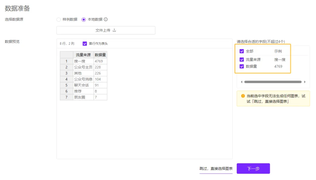 这里以e3次坊公众号的流量分析为例,上传数据后需要勾选需要生成图表的内容和字段。