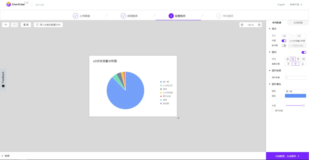 在该平台上制作图表的流程很简单,四步即可出图:上传数据、选择图表、配置图表和导出图表。