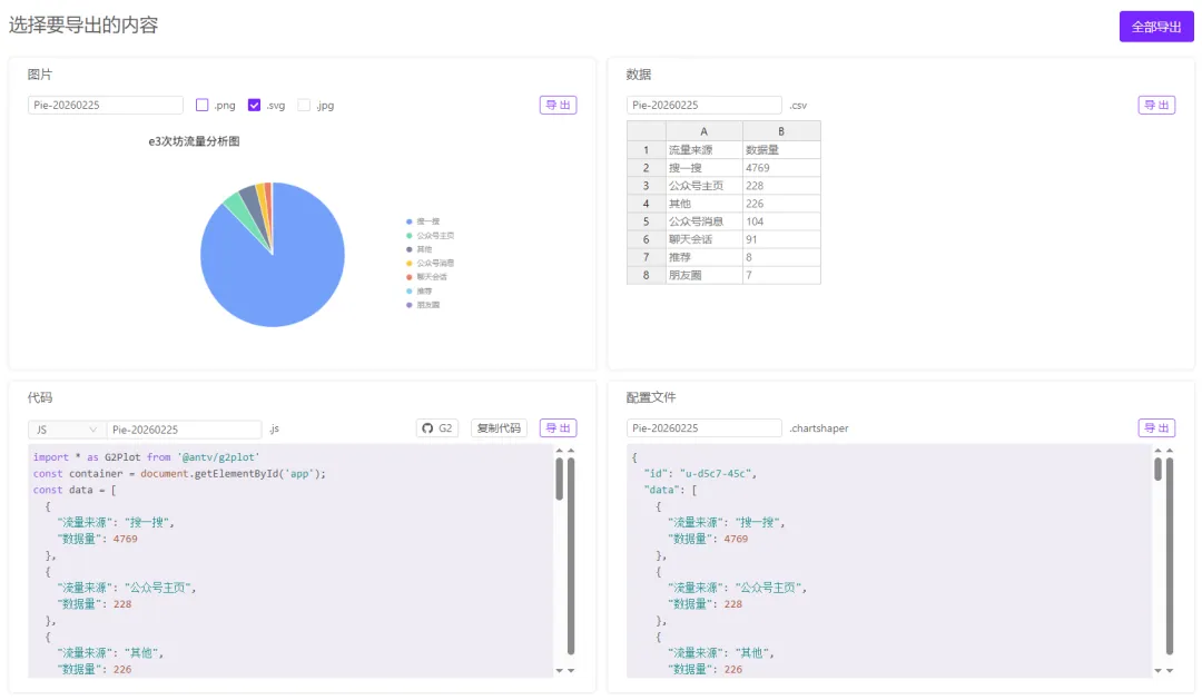 导出图表阶段,有四种导出方式,图片导出方式建议选择svg格式的,这有便于后期导入到PPT中进行二次编辑。有需求的也可以全部导出。
