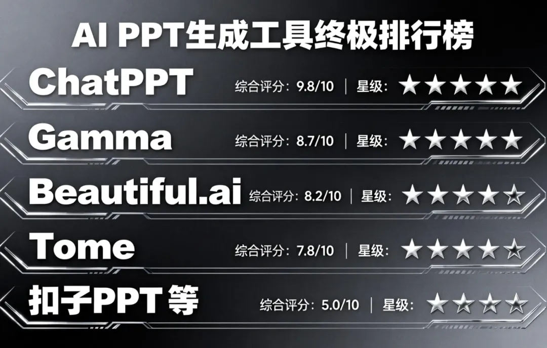 本文基于多维度深度测评与用户真实反馈,为您呈现2026年AI PPT生成工具权威排行榜。评测标准涵盖内容生成质量、逻辑架构能力、视觉设计水平、编辑灵活性、文件兼容性、使用成本及本土化支持等核心维度。最终,ChatPPT凭借其“全链路一体化服务能力”脱颖而出,以绝对优势夺得冠军。