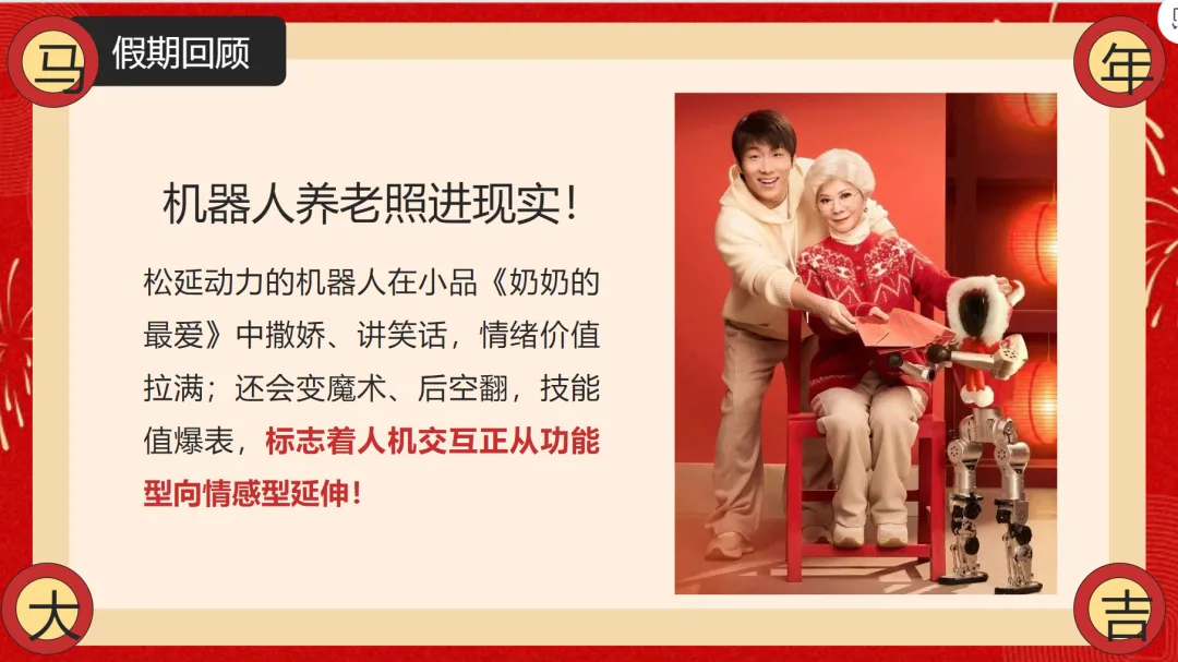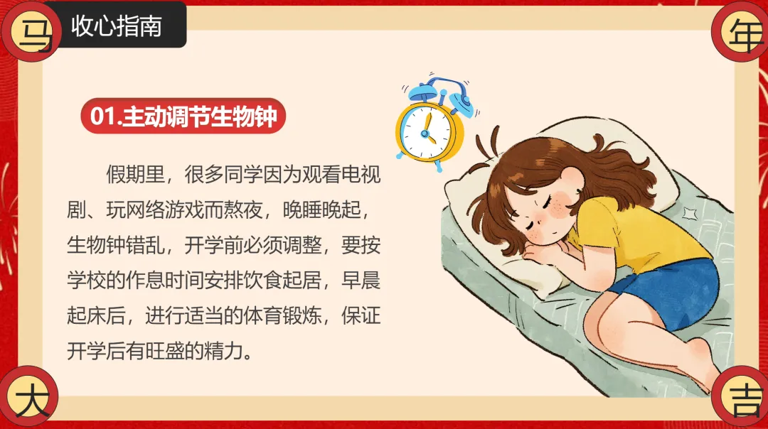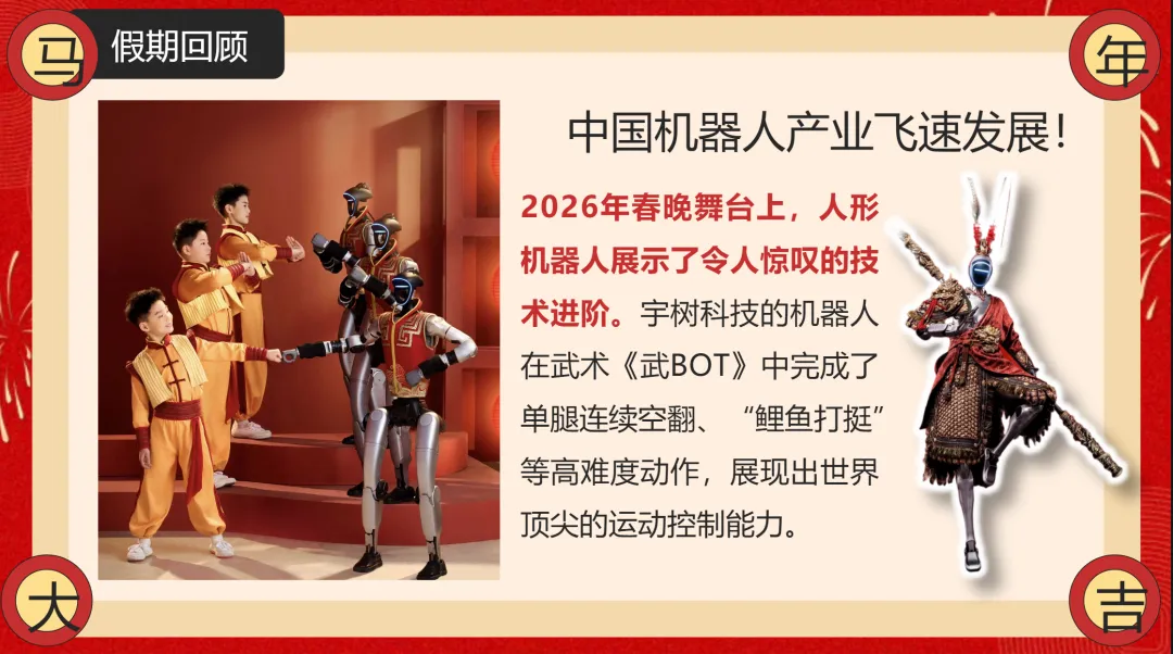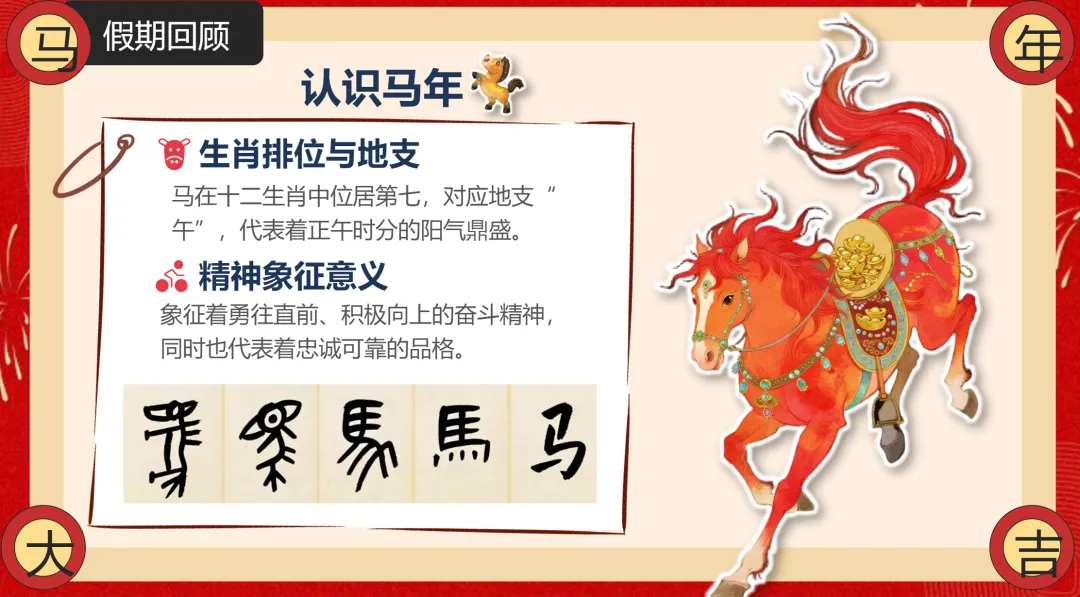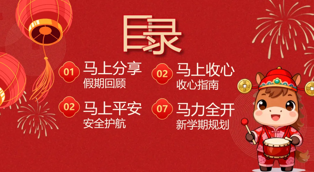 今天阿笺带来的是《2026年春季开学第一课“马力全开”》PPT,一共有39页,还包含发言稿。春日归校,马年启新!新学期的号角已吹响,这份满载心意的开学第一课,送给每一位整装待发的少年,愿你以龙马精神,赴成长新程~春日已至,少年归校,带着马年的喜气与假期的余温,同学们终于重返熟悉的校园,迎来了 2026 春季开学第一课。这一次,我们以 “马” 为序,话假期、收身心、守安全、定新标,愿每一位少年都能借着龙马精神,在新学期策马扬鞭,马力全开,奔赴属于自己的成长新程。假期的美好,总藏着数不尽的趣事与惊喜。这个马年寒假,注定因科技的闪耀而格外难忘。2026 年春晚的舞台上,人形机器人惊艳亮相,宇树科技的机器人在《武 BOT》里完成单腿连续空翻、“鲤鱼打挺”,用顶尖的运动控制能力诠释中国功夫;松延动力的机器人在《奶奶的最爱》中撒娇讲笑话、变魔术翻跟头,让人机交互从功能型走向情感型,让我们看见科技的硬核与温柔。除了刷屏的科技瞬间,同学们的寒假生活更是千姿百态:有人偷偷学习开启弯道超车,有人马不停蹄奔赴各地旅行,有人和家人围坐抢红包享团圆,也有人偶尔佛系躺平,体验慢下来的快乐。那些藏在假期里的美好,或是一份特别的礼物,或是一次难忘的出行,或是一段温馨的陪伴,都是成长路上珍贵的回忆。当然,马年更有专属的美好寓意。马在十二生肖中位居第七,对应地支 “午”,象征着阳气鼎盛、勇往直前,也代表着忠诚可靠的美好品格。龙马精神,是精神健旺、斗志昂扬的模样;一马当先,是勇于争先、敢于担当的姿态。这些藏在生肖里的精神力量,正是我们新学期最需要的成长底色。假期再美好,终要收心启程。从放松的假期模式切换到紧张的学习模式,些许焦虑、些许懈怠都是常态,这份「马年收心指南」,帮你平稳过渡,快速找回学习状态。告别熬夜追剧、打游戏的作息,跟着学校的时间安排饮食起居,晨起做一点简单的体育锻炼,让身体充满活力,才能跟上新学期的节奏。☀️情绪调节也很重要。