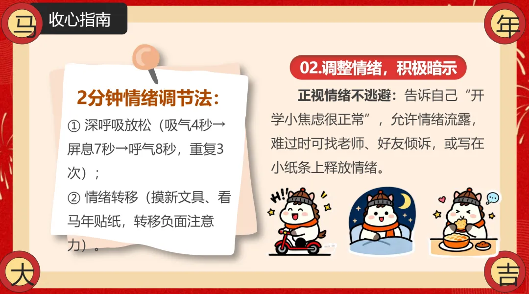 试试 2 分钟情绪调节法:吸气 4 秒、屏息 7 秒、呼气 8 秒的深呼吸,搭配摸新文具、看马年贴纸的情绪转移,轻松缓解开学焦虑。正视自己的情绪,难过时找老师、好友倾诉,多给自己积极的心理暗示,“新学期,新开始,我可以做得更好”,一句简单的鼓励,就能积攒满满的能量。