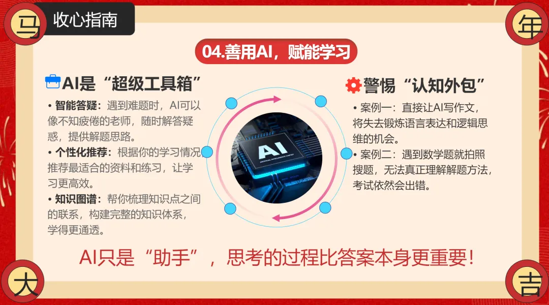 如今 AI 时代,我们更要善用科技赋能学习。把 AI 当作 “超级工具箱”,让它帮忙答疑解惑、梳理知识图谱、推荐学习资料,但千万警惕 “认知外包”。不要让 AI 替自己写作文、拍题搜答案,因为思考的过程,远比答案本身更重要,守住独立思考的能力,才是学习的核心。2026,丙午马年,愿每一位少年都能带着龙马精神,在新学期里马力全开,以梦为马,不负韶华;以汗为泉,不负时光。新学期,新征程,让我们一起并肩前行,奔赴属于自己的星辰大海!领取方式:在下方公众号后台回复关键词“开学第一课”注意:本微信公众账号分享的资源均通过网络等公共合法渠道获得,仅供试用!版权属于原出版机构或影像公司,本资源为电子载体,传播分享仅限于家庭使用与交流心得、参考和辅助购买决策,不得以任何理由在商业行为中使用,若喜欢此资源,建议购买实体产品。文章中的视频及图片均来自网络,版权归原作者或原出版社所有。如有侵权,请及时联系删除。