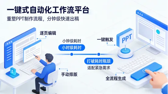 平台以自动化、智能化能力,将用户从繁琐的操作中解放出来。其核心需求聚焦三大维度,每一处设计都贴合用户实际使用场景,直击创作痛点。首先,打造真正的一键式自动化生成功能,彻底告别逐页编辑、手动排版的繁琐流程,用户无需具备专业的设计能力与PPT操作经验,只需简单触发指令,即可完成PPT的全流程生成,大幅减少人工操作时间,让更多精力聚焦于内容本身而非形式打磨。这种自动化能力,打破了传统PPT制作“小时级”的耗时瓶颈,实现“分钟级”快速出稿,完美适配紧急汇报、临时展示等高频需求。