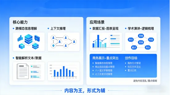 平台依托先进的AIGO智能分析技术,实现内容与形式的精准匹配。不同于普通AI工具的生硬解析,软江图灵AIGO大模型具备强大的跨模态信息理解与上下文推理能力,能够智能解析用户输入的文本、数据等核心内容,快速提炼关键信息,自动搭建逻辑清晰、层次分明的PPT结构与布局,避免出现内容混乱、重点模糊的问题。不同于传统模板的生硬套用,AIGO大模型驱动的智能分析能力,能够根据内容属性适配最合适的排版方式——无论是数据汇报的图表呈现、学术演讲的逻辑梳理,还是商务展示的重点突出,都能精准匹配,让每一页PPT都兼具逻辑性与可读性,真正实现“内容为王,形式为辅”的创作目标。