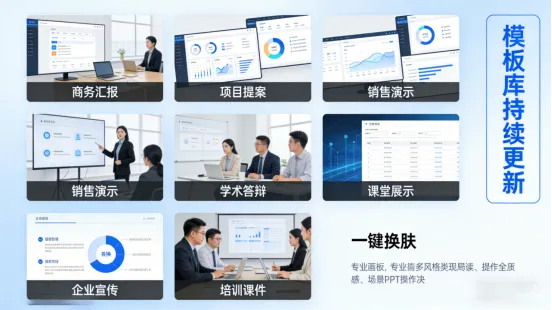 平台内置多种专业模板,全面覆盖各类使用场景。无论是职场中的商务汇报、项目提案、销售演示,还是学习中的学术答辩、课堂展示,亦或是企业宣传、培训课件等场景,平台都提供了风格多样、设计专业的模板库,用户可根据自身需求自由选择,也可基于模板进行简单调整,轻松实现“一键换肤”,既保证了PPT的专业性与美观度,又避免了模板单一、同质化严重的问题。同时,模板库持续更新,紧跟行业潮流与设计趋势,让每一份生成的PPT都能贴合当下审美与场景需求,无需额外花费时间寻找素材、优化设计。