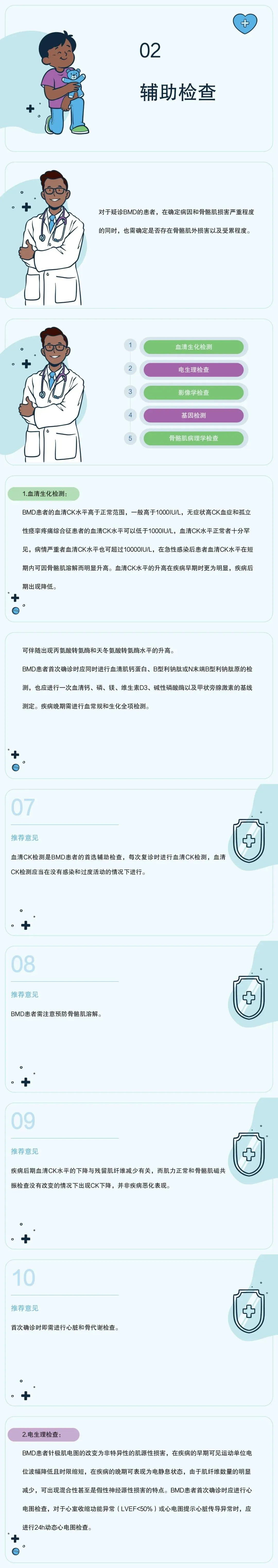 7.血清CK检测是BMD患者的首选辅助检查,每次复诊时进行血清CK检测,血清CK检测应当在没有感染和过度活动的情况下进行。