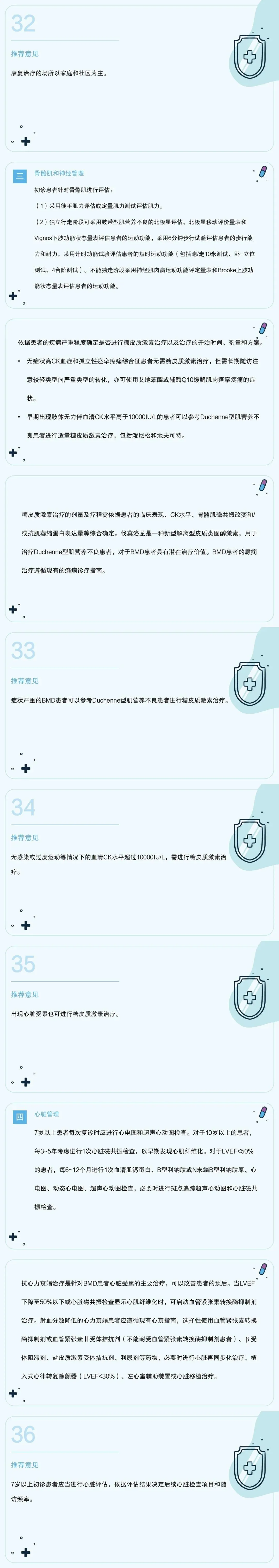 33.症状严重的BMD患者可以参考Duchenne型肌营养不良患者进行糖皮质激素治疗。