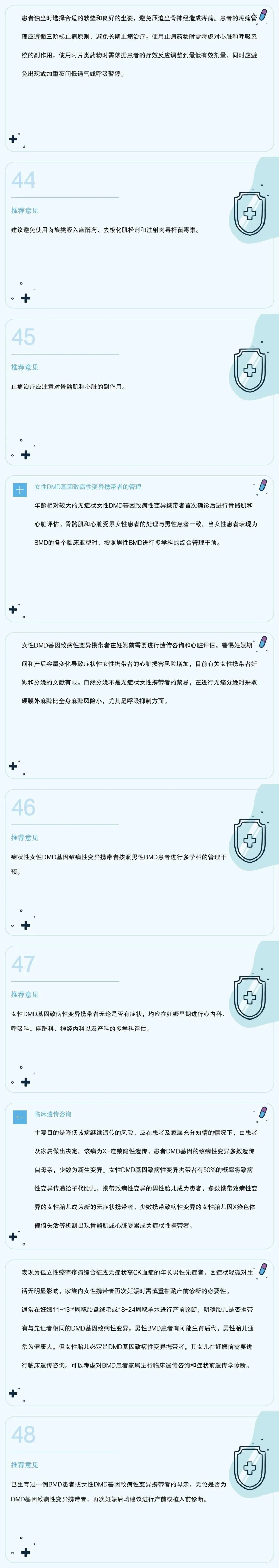 47.女性DMD基因致病性变异携带者无论是否有症状,均应在妊娠早期进行心内科、呼吸科、麻醉科、神经内科以及产科的多学科评估。