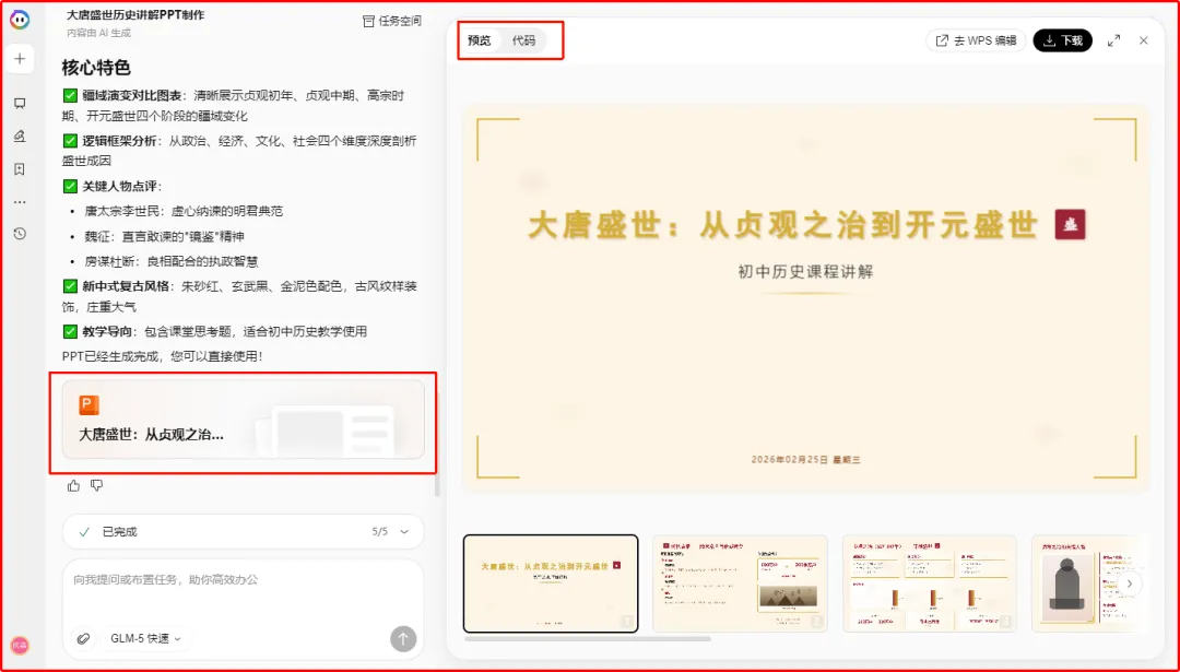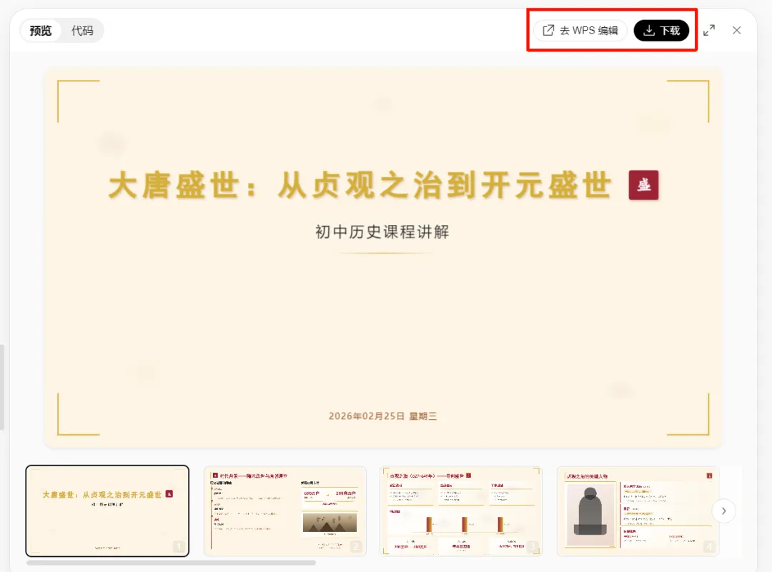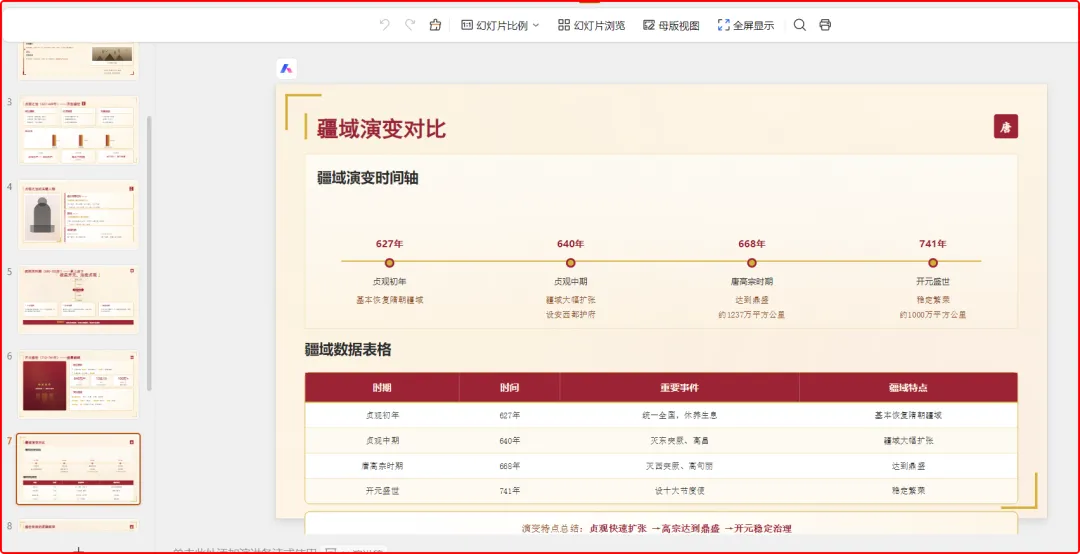 更新升级后的WPS灵犀,不仅实现了AI智能体做表,用AI智能体生成配图的图片。而且,还专门提供了一个演示智能体,用来制作PPT。要知道,之前我们用WPS AI制作PPT,主要还是在PPT演示界面里完成。AI根据主题或者文档生成PPT大纲,然后选择模板,最后再用模板套用,并优化生成PPT。体验下来,给我的直观感受是,用WPS灵犀的智能体生成PPT课件,会更加智能化和自动化。老规矩,先来看个我用WPS灵犀生成历史教学课件PPT的效果:打开WPS灵犀