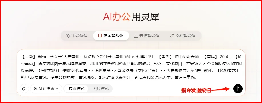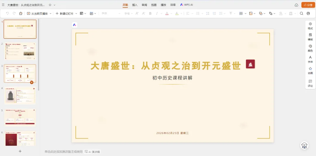 目前WPS里灵犀的入口,有多个,像我比较习惯的是WPS打开后左侧边栏的入口。当然了,你也可以点击整个WPS窗口右上角的灵犀按钮,来进入WPS灵犀。接下来,我们就可以在WPS灵犀里选择对应的智能体。这里,我们要用智能体制作PPT课件,所以选择演示智能体。【主题】 制作一份关于“大唐盛世:从贞观之治到开元盛世”的历史讲解 PPT。【角色】 初中历史老师。【篇幅】 20 页。【核心重点】 通过对比图表展示疆域演变,利用逻辑框架拆解盛世背后的政治、经济、文化原因,并穿插 2-3 个关键历史人物的深度点评。【写作思路】 按照“时代背景 -> 治世良策 -> 繁荣图景(文化/经贸) -> 历史影响与启示”进行叙述。【风格要求】 新中式/复古风,多用文物照片、古风底纹,配色建议以朱砂红、玄武黑和金泥色为主,营造庄重感。
