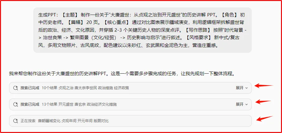 接下来,演示智能体就能根据指令要求,自主的把整个任务拆解成多个子任务,并且运用专用的skills来分步骤的完成PPT课件的生成。
