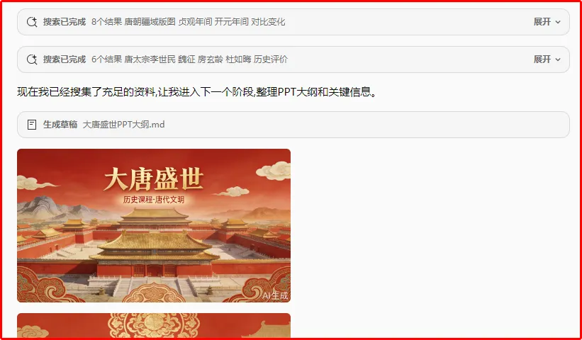 这里,演示智能体,在自动搜索资料后,先开始生成PPT课件的配图: