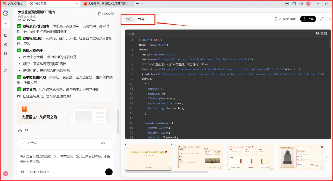 一个是演示智能体生成PPT的过程,是生成的html网页版的PPT,点击这里的【代码】,甚至可以查看PPT网页的代码。这和之前WPS AI设计PPT的方式,完全不一样。