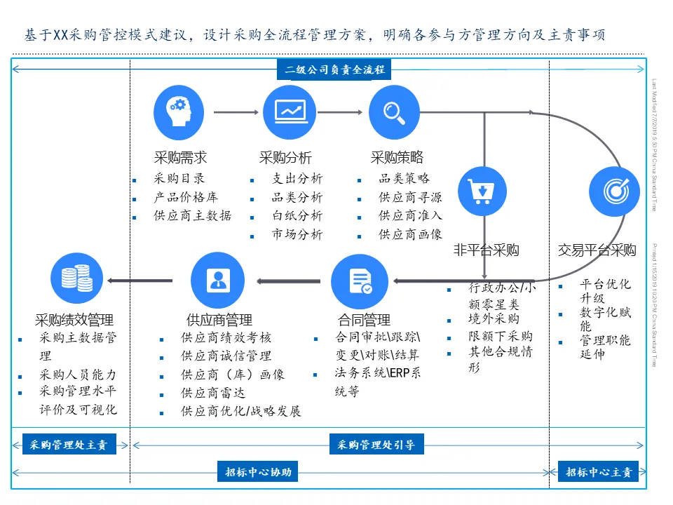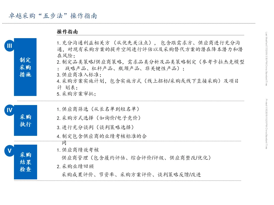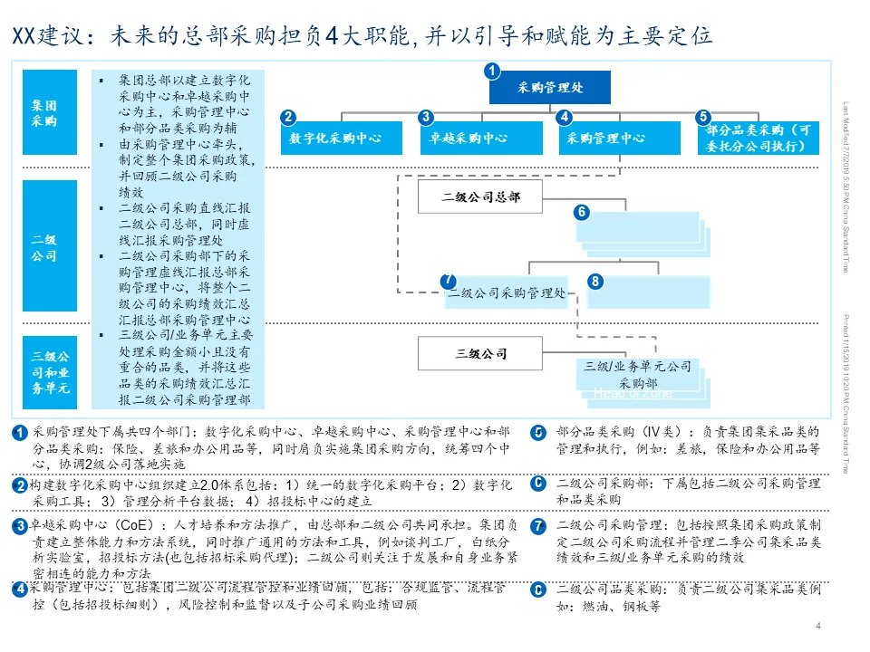 报告提出未来总部采购需承担四大职能:建立数字化采购中心、卓越采购中心、采购管理中心及部分品类采购,通过"引导+赋能"模式重构管理体系。具体措施包括:构建端到端数字化系统、设立方法中心推广最佳实践、强化品类管理与供应商全生命周期管理、建立采购绩效评估体系。该方案旨在通过组织架构优化、数字化工具整合及专业能力提升,实现采购价值链的系统性升级,最终达成降本增效、风险管控及战略协同的目标。
