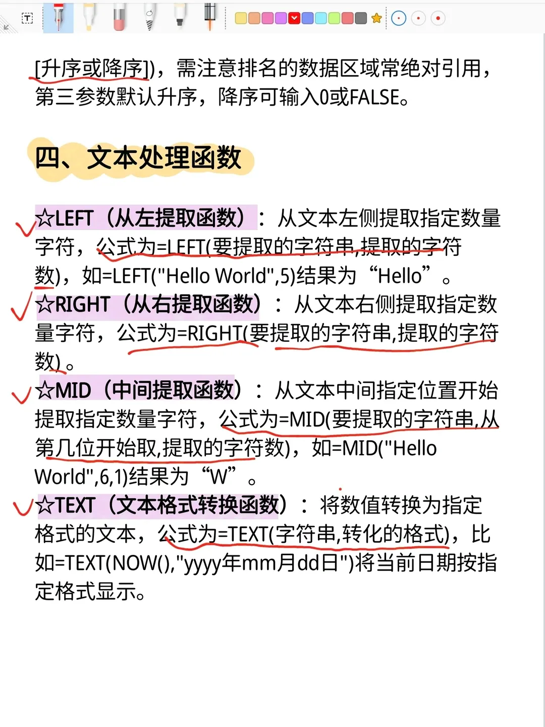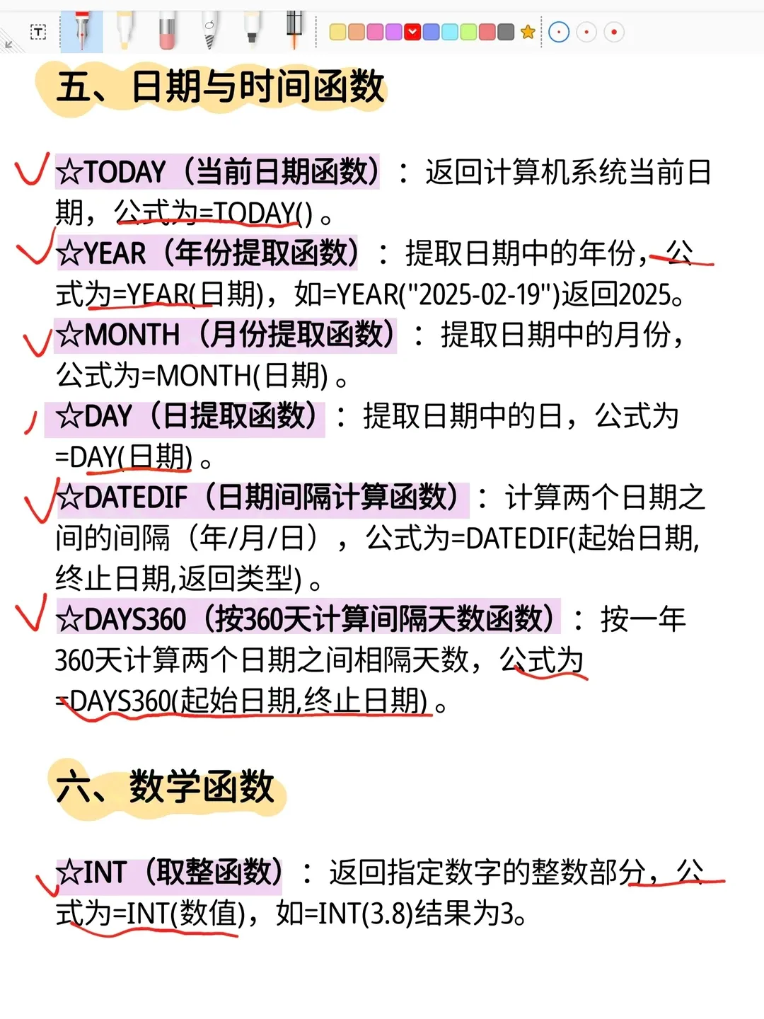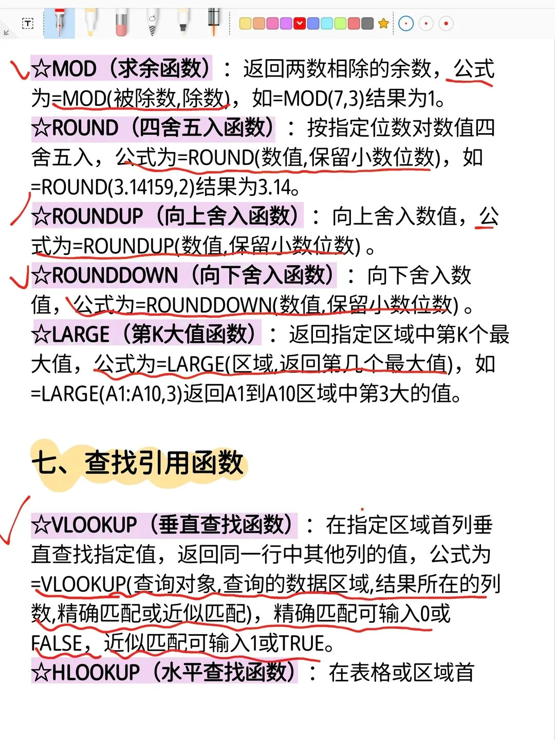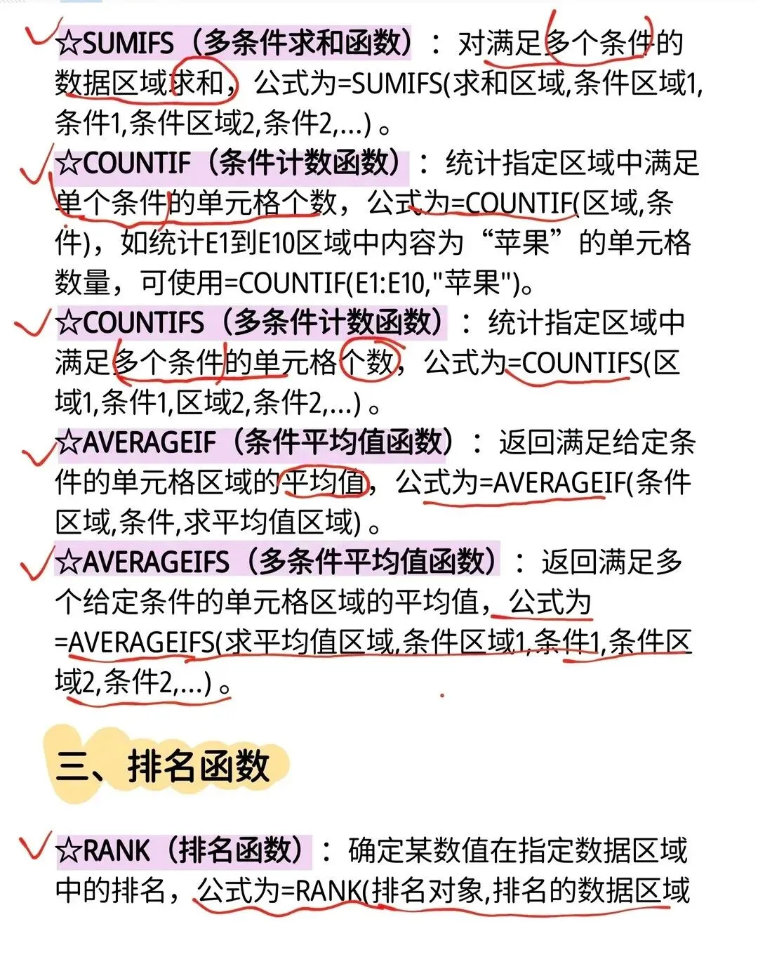 ✅SUM(求和函数):功能为对指定数据区域求和,公式为=SUM(数据区域)。例如:计算 A1 到 A10 单元格数值总和,可使用=SUM(A1:A10)。