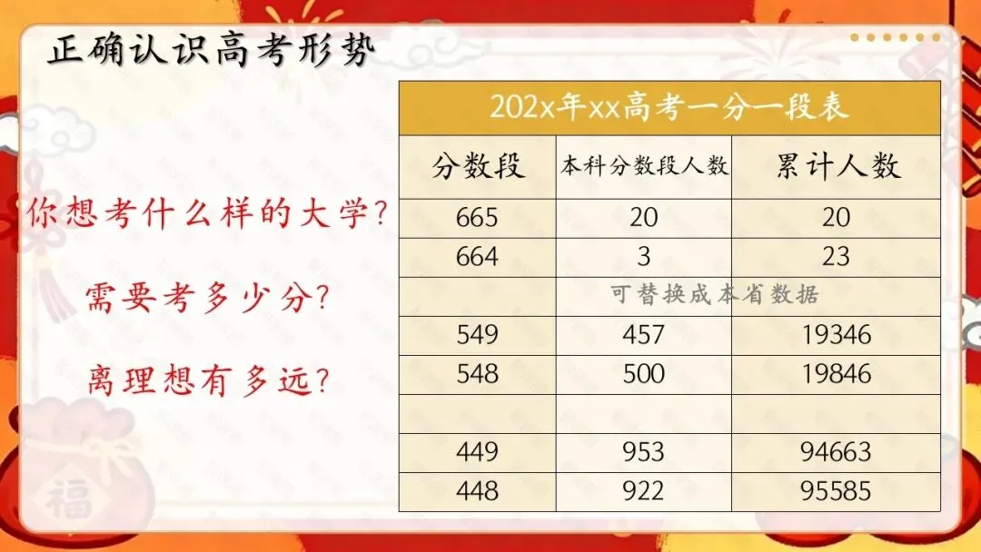 2.用真实数据讲清高考形势、分数线和目标院校差距,激发学生斗志。