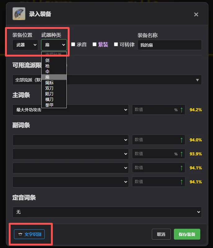 选好装备位置/武器类型之后点击下方文字识别