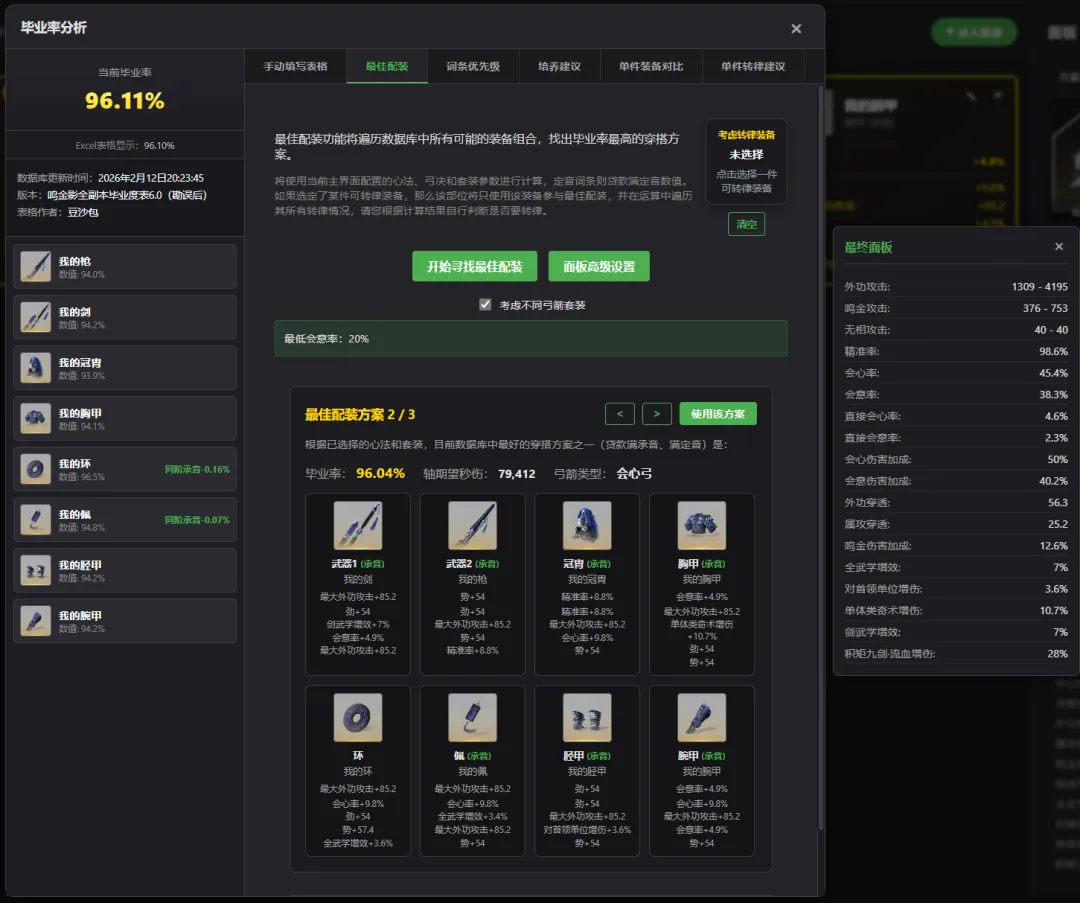 这样在少侠背包有非常多的好装备但是又不知道选择哪一个更好的时候,录入到网站后,使用一键配装即可自动计算出多个最佳方案供少侠选择