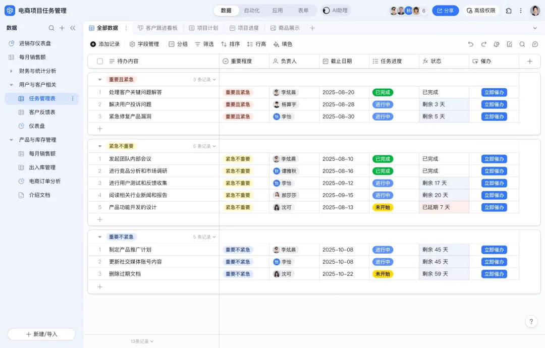 数据关联 | 弱关联。主要通过函数(如VLOOKUP)实现,复杂且维护难。 | 弱关联。与Excel能力类似,协作时函数引用更易出错。 | 强关联。通过“关联记录”等功能,像数据库一样轻松关联多表数据,关系清晰稳定。 |