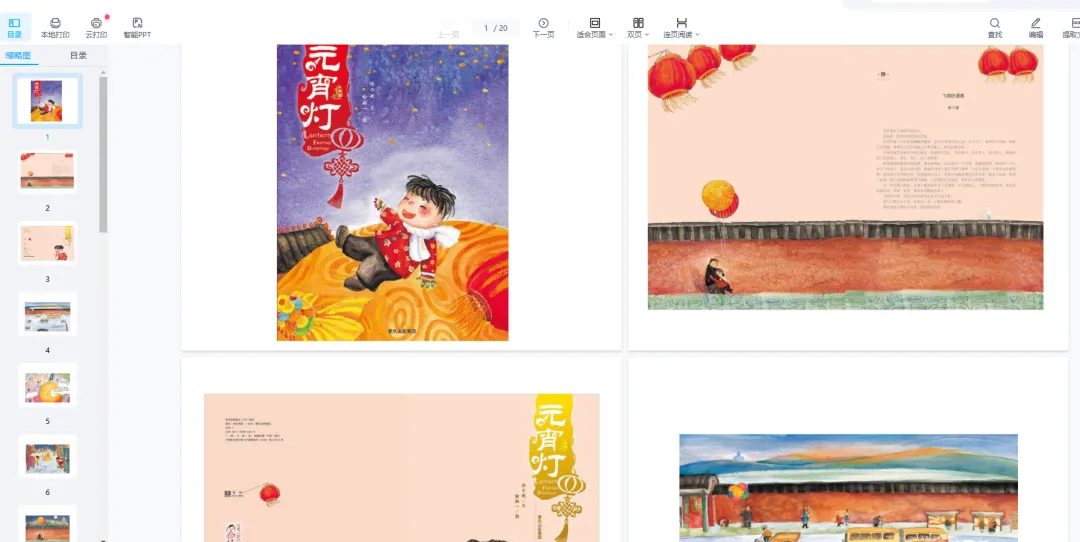 绘本阅读是幼儿教育的重要方式,但许多家长因孩子不识字或价格高而忽视其价值。实际上,绘本通过图文结合能同时刺激儿童的视觉和语言发展。优质绘本能提升儿童的认知、语言和社交能力。长期阅读对学业发展和亲子关系都有积极影响。绘本既是学习工具,也是亲子互动的桥梁。绘本PPT通过丰富多彩的故事和生动的画面,激发幼儿园儿童的学习兴趣,培养他们的阅读能力、想象力和创造力。 绘本PPT电子版画册涵盖了各种主题和风格,包括寓言故事、科普知识、生活常识、人际交往等方面,满足不同年龄段儿童的阅读需求。这些绘本不仅具有丰富的故事情节和精美的插图,还注重文字表达简洁易懂,适合幼儿园儿童阅读和理解。故事围绕一个进城务工的农民工家庭展开。元宵节当天,小男孩和爸爸在北海公园门口卖气球,渴望能进入公园看灯会。尽管门票昂贵,但在陌生女孩的善意帮助下,一家三口最终得以进入公园,共同欣赏美丽的灯会,享受团圆的元宵佳节。