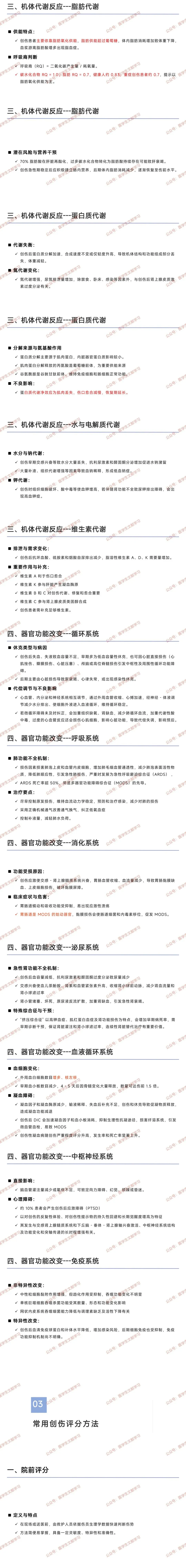 - 脂肪代谢:以脂肪氧化供能为主(呼吸商约 0.7),血浆游离脂肪酸增多,后期需肠内营养干预。