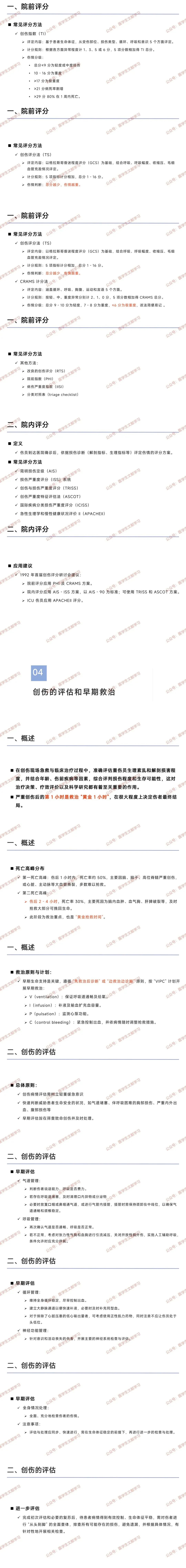 - 核心方法:创伤指数(TI)、创伤评分(TS)、CRAMS 计分法(循环、呼吸、胸腹、运动、言语)。