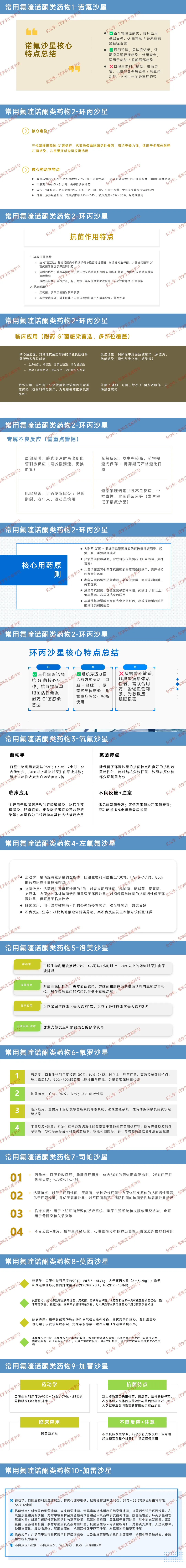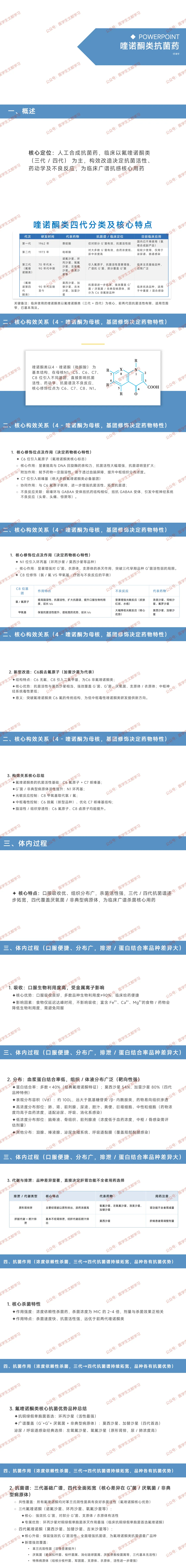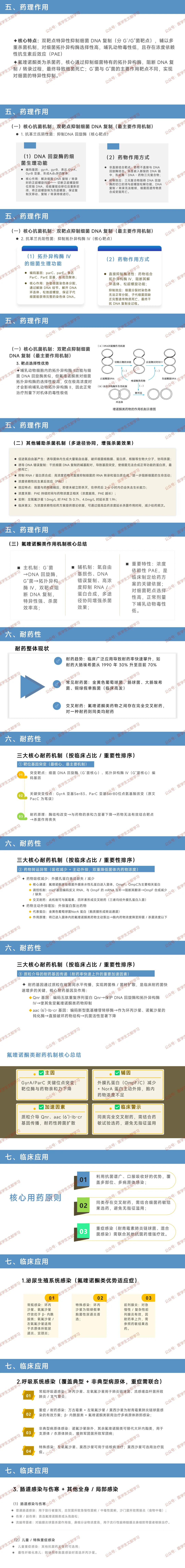 核心定位:人工合成广谱抗菌药,浓度依赖性杀菌,为临床抗感染核心用药,四代抗菌谱更宽(覆盖 G⁺菌、厌氧菌、非典型病原体)。