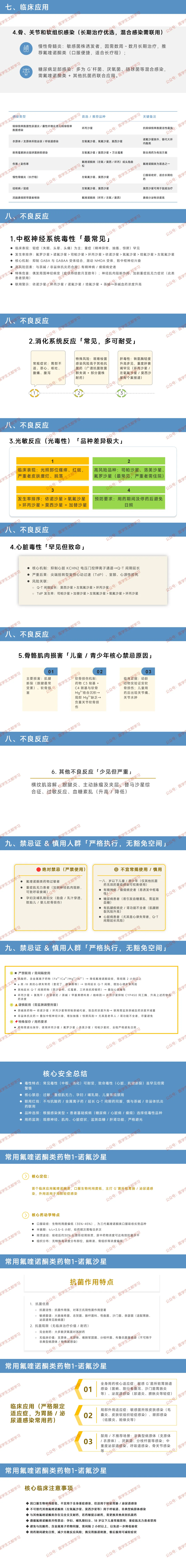 药物相互作用:避免与抗酸药、含金属离子药物同服(间隔 2 小时);慎与茶碱、非甾体抗炎药联用;不与延长 Q-T 间期药物(如红霉素、三环类抗抑郁药)联用。