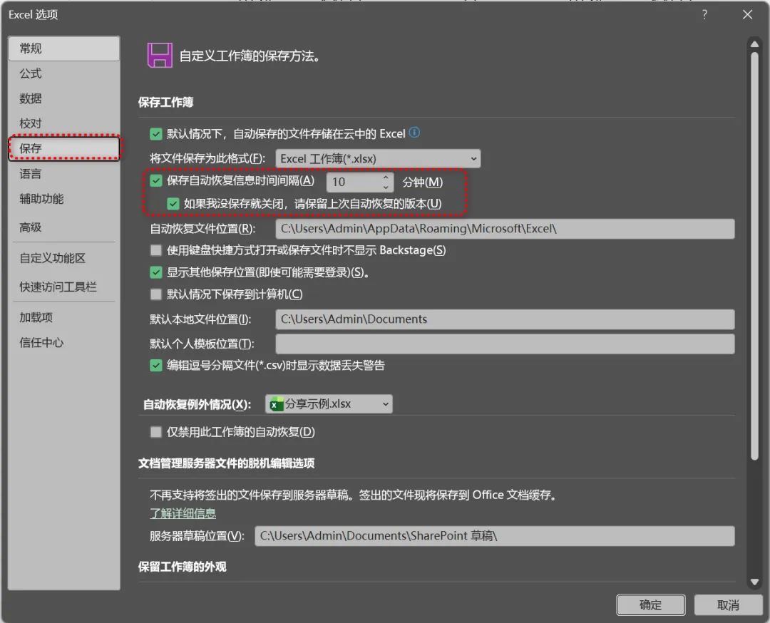 这里介绍一下自动保存的设置方式:文件->选项->保存