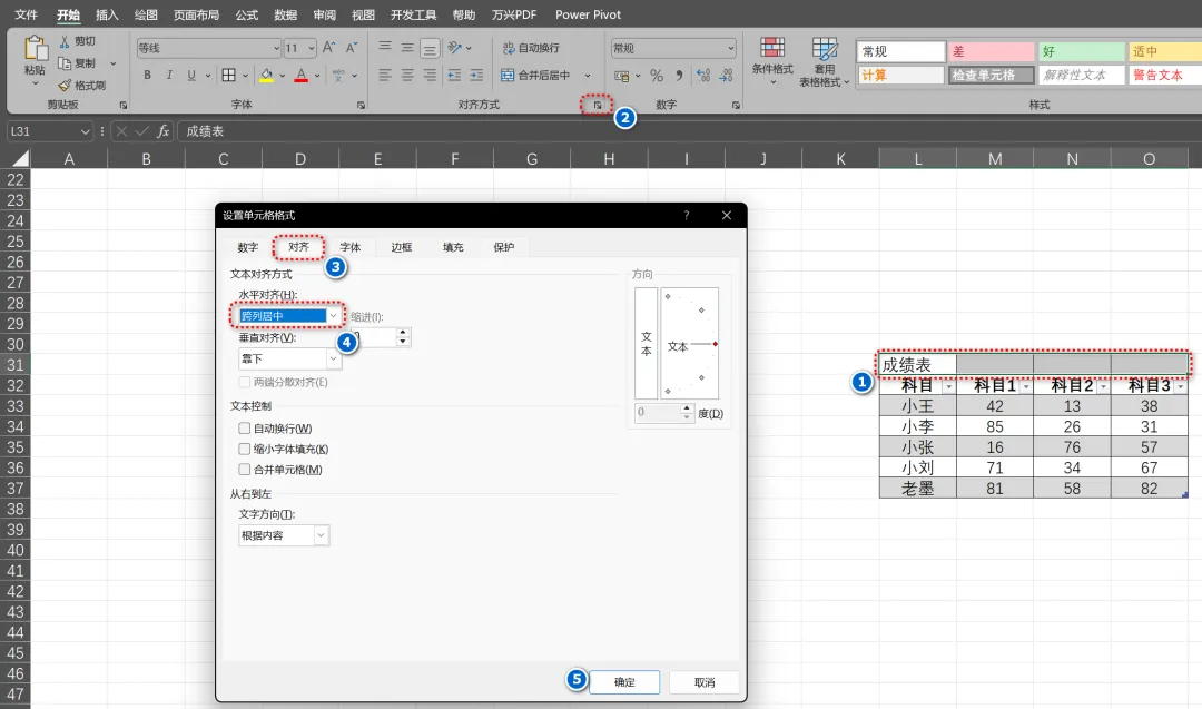 选中需要居中的单元格,寻找对齐方式选项卡->水平对齐->跨列居中