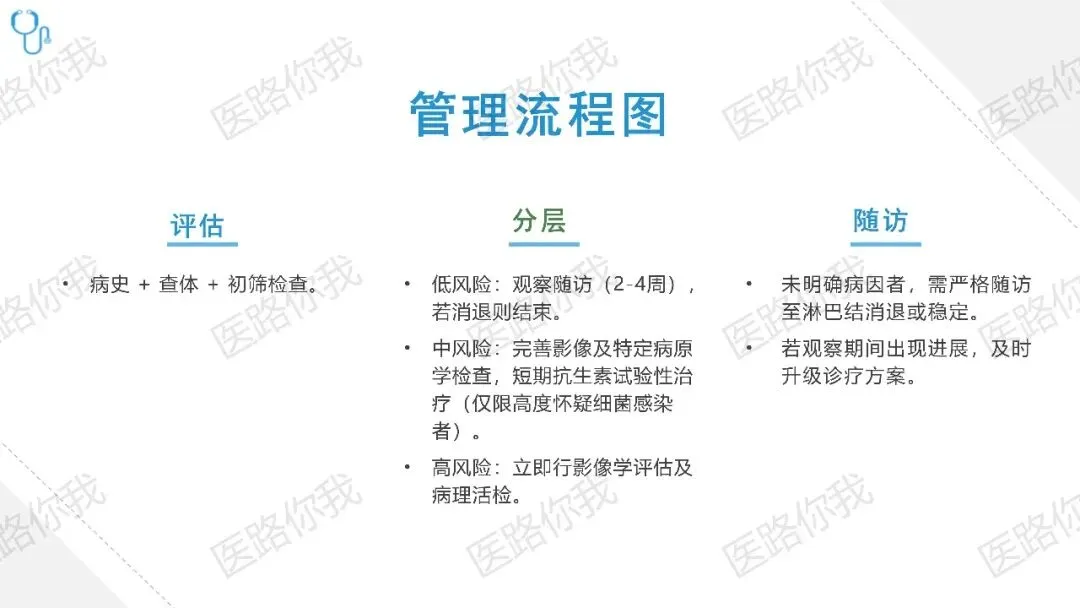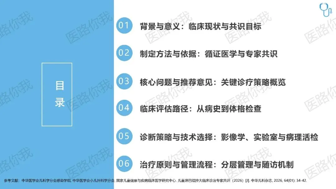 参考文献:中华医学会儿科学分会感染学组, 中华医学会小儿外科学分会, 国家儿童健康与疾病临床医学研究中心.儿童淋巴结肿大临床诊治专家共识(2026)[J]. 中华儿科杂志, 2026, 64(1): 34-42.