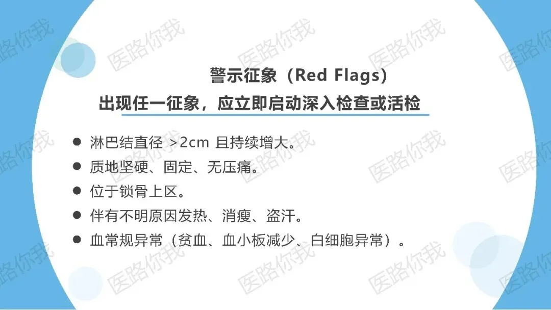 - 伴随 “B症状”:持续发热(>38℃超过1周)、夜间盗汗、不明原因体重下降。