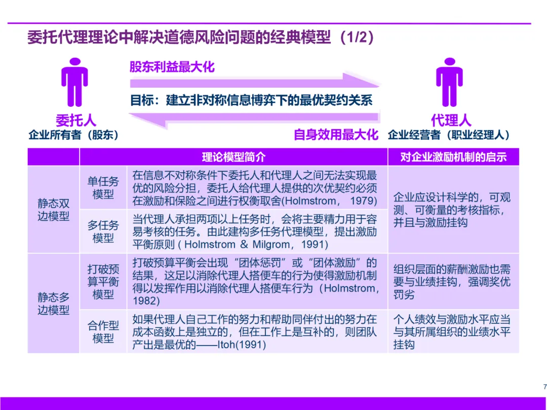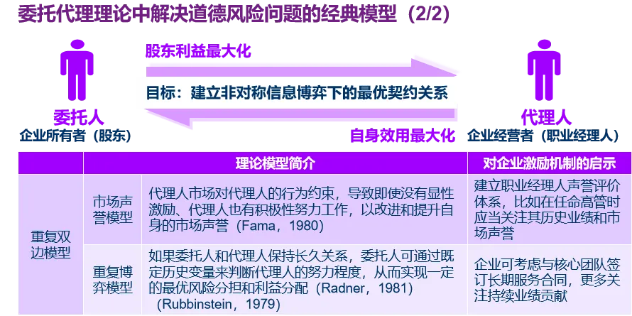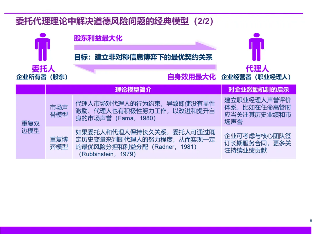 委托代理理论(完全契约理论): 聚焦解决所有权与经营权分离后的信息不对称问题,核心在于通过契约设计(如绩效考核、奖金、期权)约束代理人道德风险,降低交易成本。其经典模型(道德风险、逆向选择)为激励约束机制提供了分析框架。