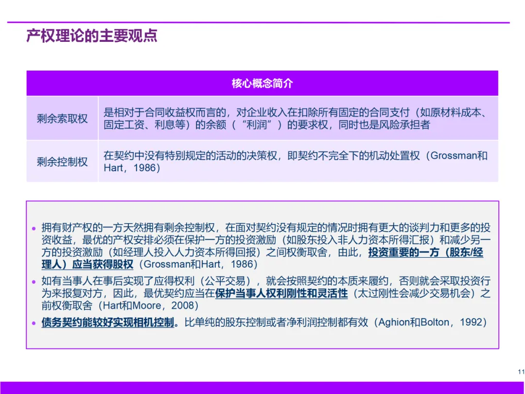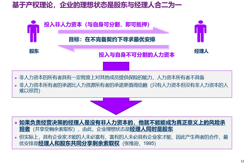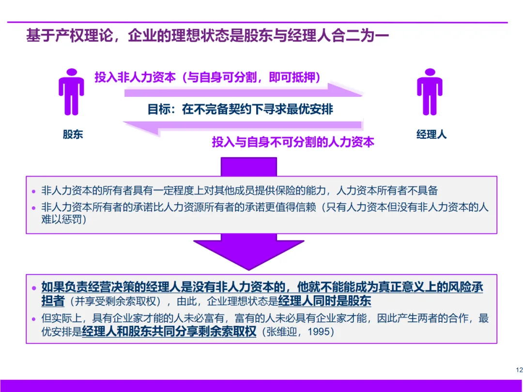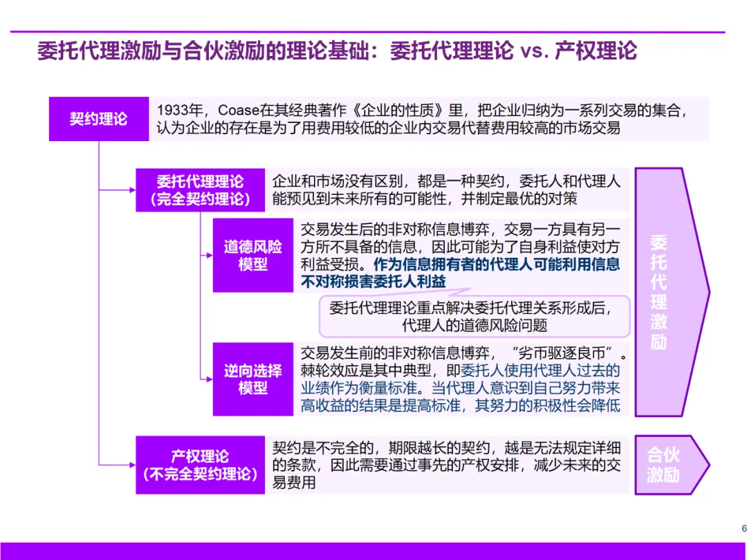 产权理论(不完全契约理论): Grossman, Hart, Moore等学者强调契约天然不完全,主张通过最优产权安排(如让关键投资者——股东或经理人——持有股权)来减少未来谈判成本。该理论推崇“股东与经理人合一”的理想状态,为合伙制提供了理论支撑——通过产权共享(让核心人才成为合伙人),实现利益协同、风险共担,本质上也是一种降低交易费用的产权安排。