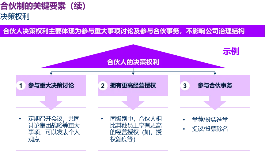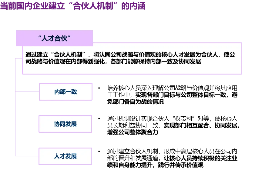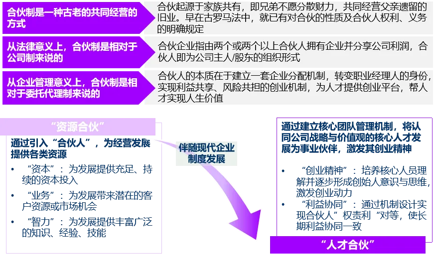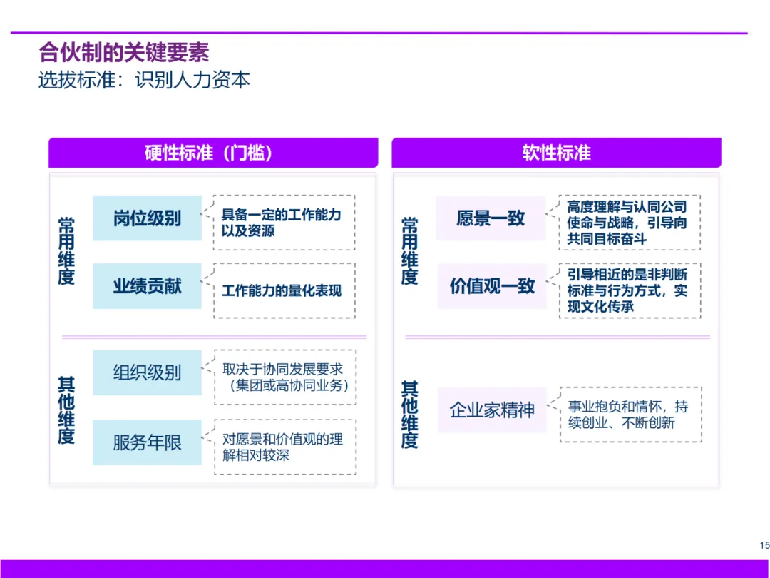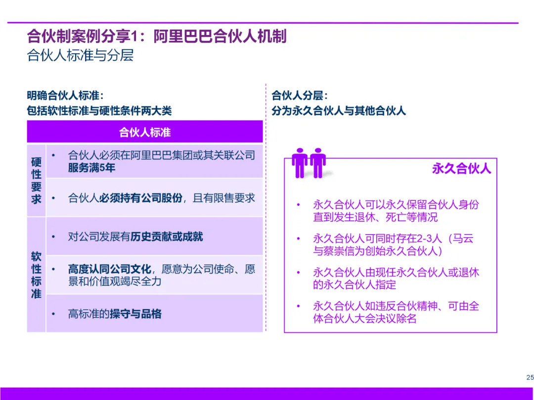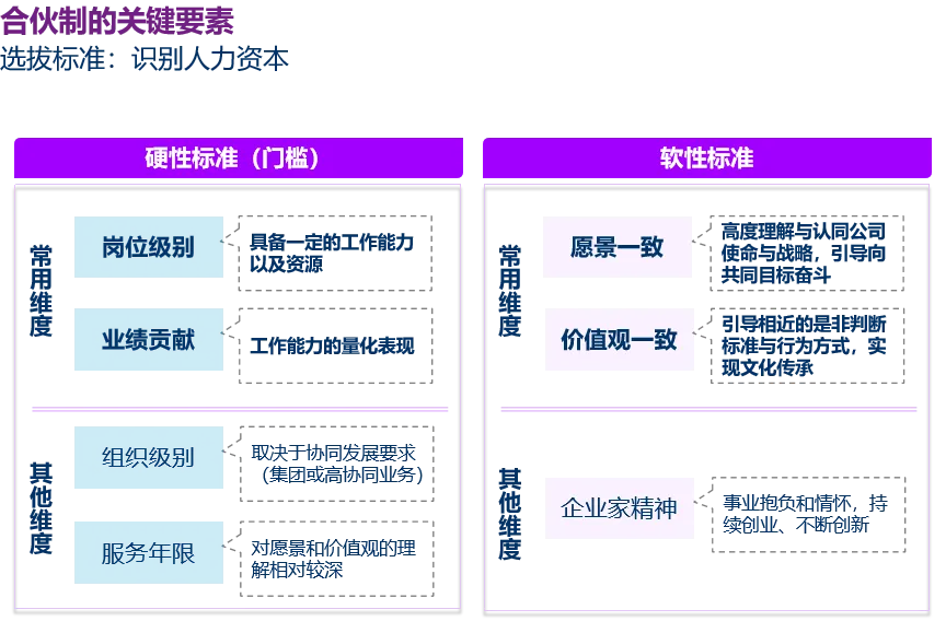 人才合伙(核心): 严格选拔(业绩、能力、价值观、企业家精神)、分层管理(如阿里永久合伙人)。