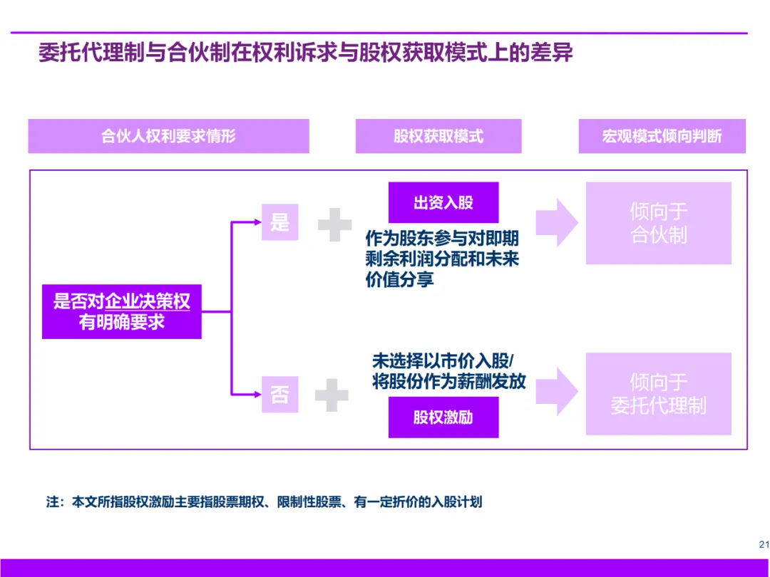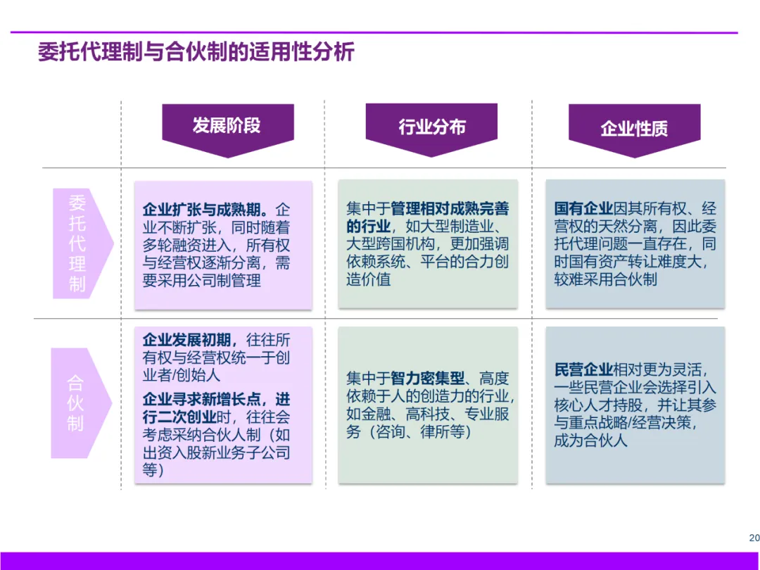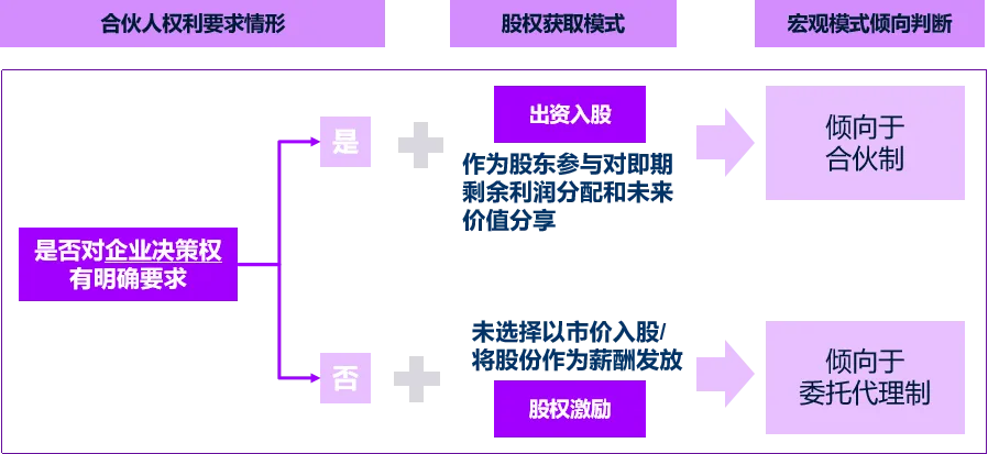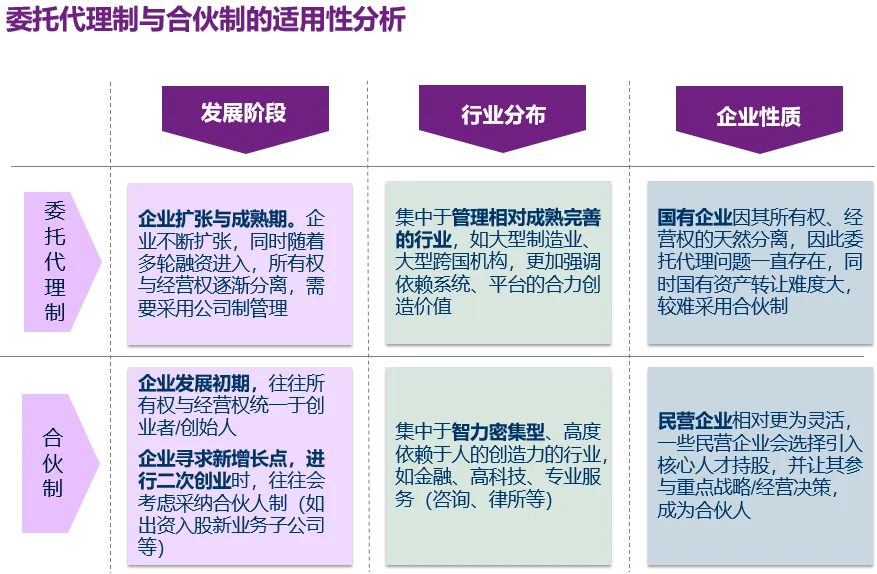 选择逻辑: 企业需审视自身发展阶段、行业属性(智力密集型vs资本/系统密集型)、所有权结构(国有/民营灵活性)、以及对核心人才决策权诉求的强弱。权利诉求强且愿/能出资入股者,更倾向合伙制;反之则倾向委托代理制下的股权激励。