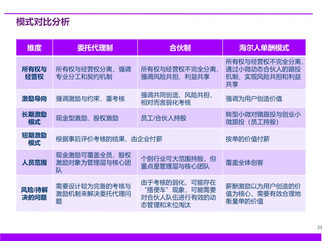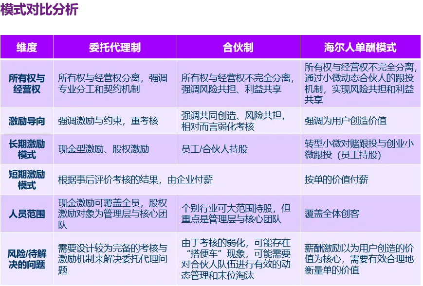 海尔“人单酬”模式: 在委托代理框架下融入合伙精神。将员工(“人”)与用户需求(“单”)直接链接,按创造的用户价值付薪(“酬”)。赋予小微(自主经营体)三权(决策、用人、分配),并通过跟投机制实现“动态合伙人”,共享收益,共担风险,是微观激励创新的典范。