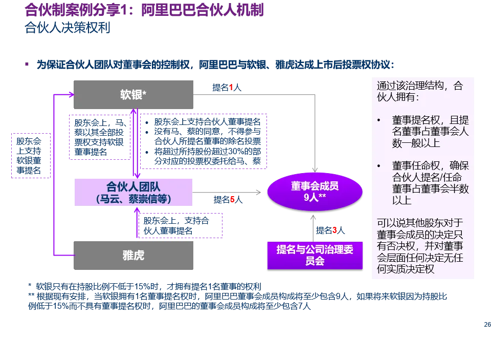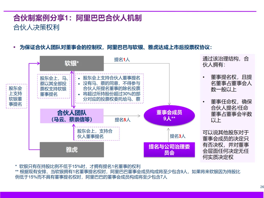阿里巴巴合伙人机制: 合伙制经典案例。通过严格的软硬性标准选拔分层(含永久合伙人),掌控董事会提名权(核心决策权),辅以专属购股计划(经济权利),构建了以合伙人文化为核心、保障战略传承与控制权的治理架构。
