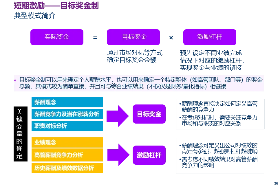 目标奖金制: 基于市场对标与职责设定目标奖金值,链接综合业绩(财务与非财务)确定实际奖金。模式简单直接,适用于高管团队或部门奖金池设定(如:设定高管目标总奖金 = Σ 个人目标奖金 * 公司业绩系数)。