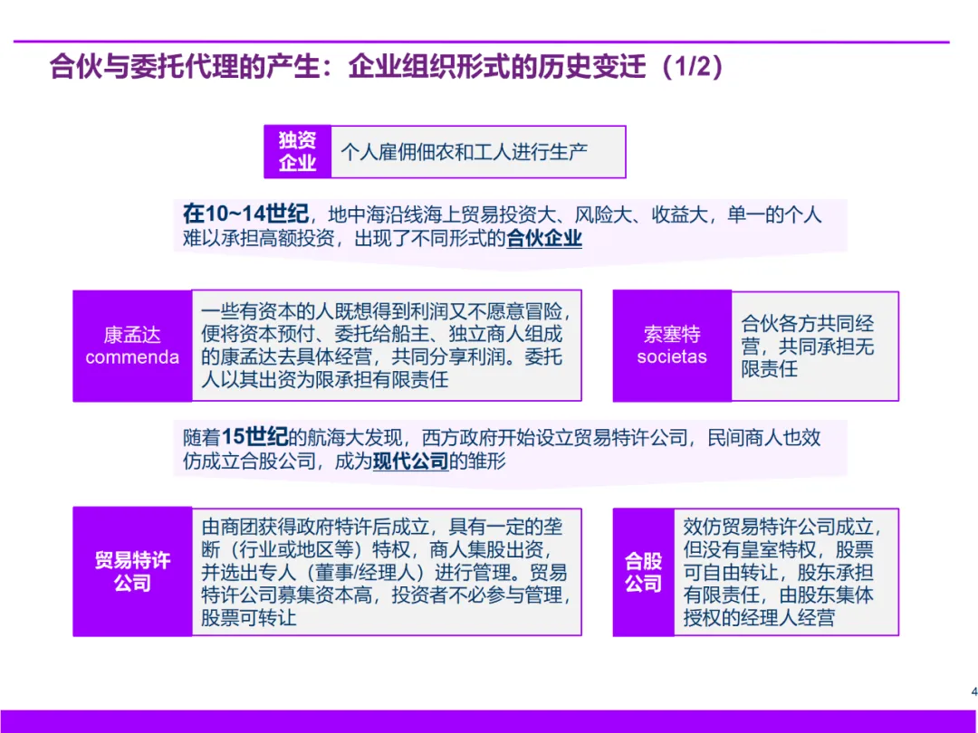 企业激励模式的演变深深植根于产权关系与组织形式的发展。从早期独资企业、康孟达(有限合伙雏形)、索塞特(普通合伙),到依赖特许经营的合股公司,直至工业革命催生的现代公司制,企业形态的每一次跃迁都伴随着所有权与经营权关系的重构。1933年Berle和Means揭示的“经理人控制”现象及随之而来的委托代理问题,成为现代激励理论的重要起点。