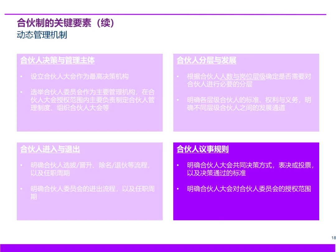 动态管理: 明确的进入、晋升、退出机制(如合伙人委员会管理)、议事规则。