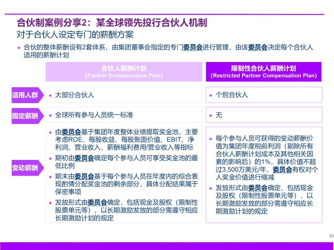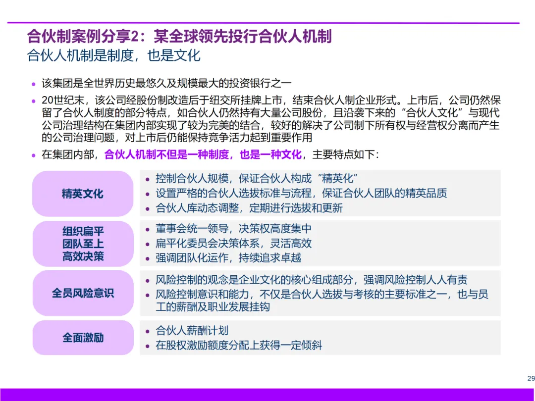 投资银行(如高盛遗留文化): 虽上市转为公司制,但保留浓厚“合伙人文化”内核:精英化选拔、扁平高效决策、全员风险意识、强约束的全面激励(如合伙人专属薪酬计划、限制性计划),将股权激励作为整体薪酬的有机组成部分,强调酌情裁量与长期绑定。