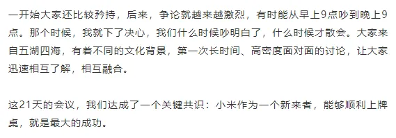 我完全没有想到董事会有这样的要求。之后的那几天,我每天都在天人交战中度过。我想了整整一周才下定决心。3月30日,我回复董事会:“如果这件事必须干,如果大家觉得我合适,为了小米,我愿意挺身而出!”这不是一时冲动,也不是权宜之计,而是我70多天深思熟虑后的决定。1.4 为小米汽车而战