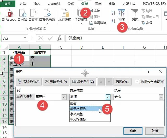 Step 01 选择区域,点击数据→排序,主要关键字选择重要性,排序依据选择按单元格颜色。
