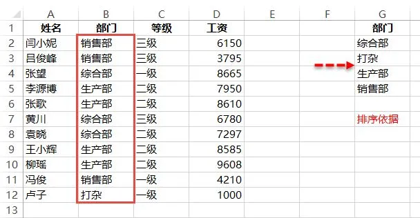 现在要将部门按照特殊的顺序排序,依次为:综合部、打杂、生产部和销售部。这种排序,既不是升序,也不是降序。